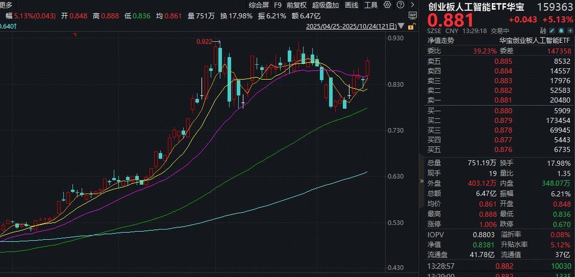 新五年规划强调科技创新的重要性配资交流论坛网站,AI产业或迎来全新发展机遇,今日(10月24日)同类规模最大、流动性突出的创业板人工智能ETF(159363)场内价格盘中猛拉5.8%,现涨5.13%,站上20日均线(通常被视为短期趋势由弱转强的关键信号),实时成交额超6.4亿元,当前成交额已超昨日全天。